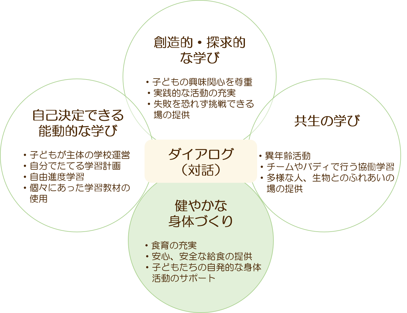 | Point 5 数値評価ではなく、ことばを基本に多角的に評価 学校からの一方的なテストや宿題は基本なく、数値評価は行いません。 |