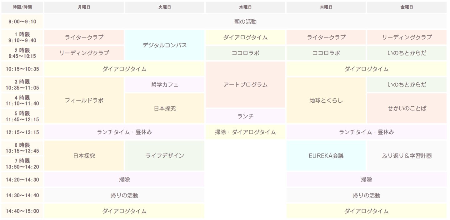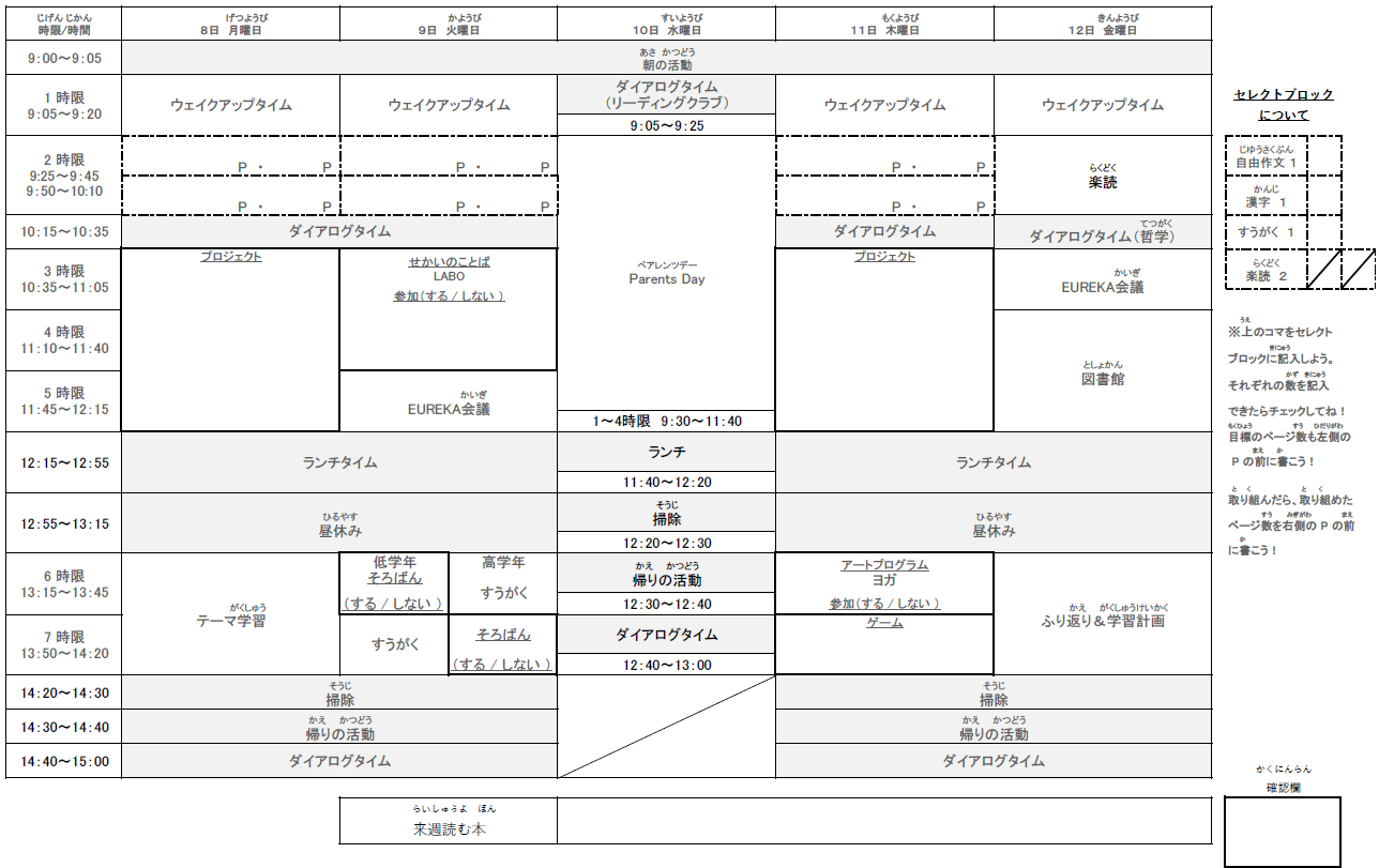 ※EUREKA小学部では毎週時間割が変わるため、上記はあくまで一例になります。毎週金曜の学習計画の際に翌週の時間割を確認し、太枠の箇所は子どもたちひとり一人が選択または内容を決めていきます。